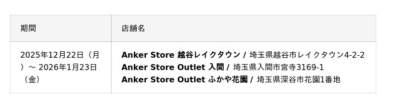 米国・日本・欧州を中心にデジタル関連製品でトップクラスの販売実績を誇るAnkerグループの日本法人、アンカー・ジャパン株式会社(本社:東京都千代田区、代表取締役CEO:猿渡 歩)は、リチウムイオン電池内蔵製品の回収促進を目指し、2025年12月22日(月)より約1ヶ月間、他社製品を含むリチウムイオン電池を内蔵した使用済みのモバイルバッテリー(※)、ワイヤレスイヤホンを回収する実証事業を、埼玉県内のAnker Store 3店舗(Anker Store 越谷レイクタウン / Anker Store Outlet 入間 / Anker Store Outlet ふかや花園)にて実施いたします。