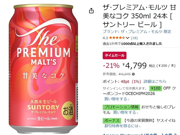 「ザ・プレミアム・モルツ 甘美なコク 350ml 24本」がAmazonタイムセールに登場!