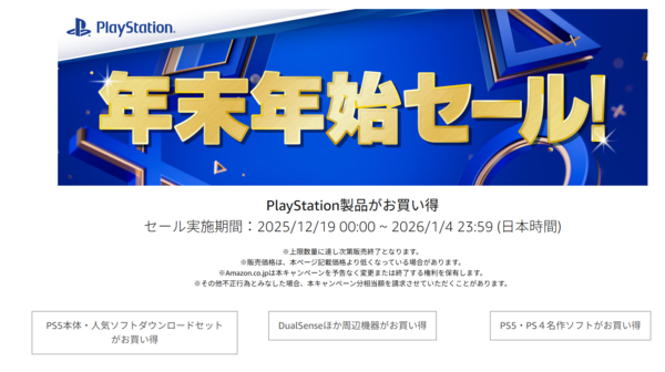 Amazon.co.jpにて、PlayStation関連の製品がお買い得になる「年末年始セール」を開催中。期間は2025年12月19日~2026年1月4日23時59分まで。