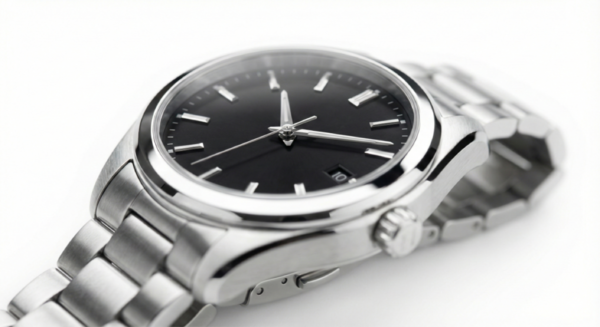 プロンプト:High-end luxury watch product photography on pure white seamless background. Silver stainless steel bracelet with black dial face. Shot with 85mm macro lens at f/2.8 for shallow depth of field. Key light from 45-degree angle creating specular highlights on metal surface. Subtle rim light separating the watch from background. Focus on the watch face with bokeh blur on the band edges. Professional studio lighting setup with softbox diffusion. Shot resembling Hasselblad medium format quality. Clean, minimal composition for e-commerce catalog.