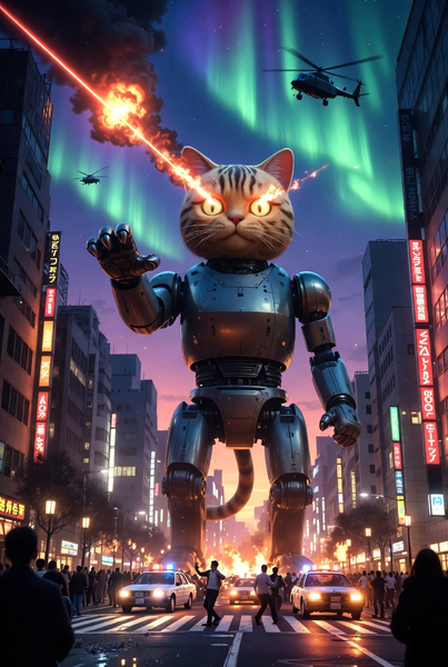 プロンプト:巨大な招き猫ロボット(高さ50メートル)が渋谷交差点に立っている。ロボットの目からレーザービームが発射され、空には爆発のエフェクト。周りには逃げ惑う人々とパトカー、ヘリコプター。ビル群には「SALE 90% OFF」「ラーメン」などのネオンサイン。夕暮れの空にはオーロラが輝き、路面には炎の反射。SF映画の破壊シーンのような、めちゃくちゃ派手で非現実的な雰囲気。画像は縦長(9:16)。