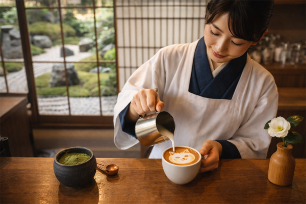 プロンプト:和風モダンなカフェの店内で、藍染めの着物に白い割烹着を羽織った女性バリスタが、ラテアートを仕上げている瞬間を捉えた写真。カウンター越しの構図で、手元のカップには猫の顔のラテアートが描かれており、泡の質感まで繊細に表現されている。背景には格子戸から見える枯山水の日本庭園があり、障子越しに差し込む柔らかな午後の自然光が空間全体を包んでいる。カウンターの上には、益子焼の抹茶パウダー入れ、銅製の計量スプーン、檜の一輪挿しに活けられた白い椿が配置されている。全体の色調は温かみのある茶系を基調とし、写実的でありながら穏やかな雰囲気の写真。