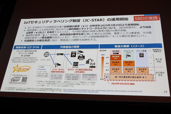 企業の対策評価と並行して進められているのが、IoT製品のセキュリティ適合性を評価するラベリング制度「JC-STAR」だ。ネットワークカメラやルーター、スマート家電など、インターネットに接続される機器が増加する中、製品自体が脆弱性を抱えていると、ユーザーがどれほど対策してもリスクは排除できない。そのため、開発段階からセキュリティを組み込む「セキュア・バイ・デザイン」の考え方に基づき、メーカー側の責任で一定の基準を満たすことが求められている。