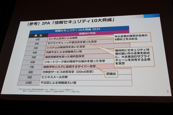 IPA(情報処理推進機構)が発表する「情報セキュリティ10大脅威」においても、ランサムウェアによる被害とサプライチェーンを狙った攻撃が上位を占め続けている。ランサムウェア被害の6割以上が中小企業というデータもあり、個社での対策だけでは脅威を防ぎきれない現状が浮き彫りになっている。