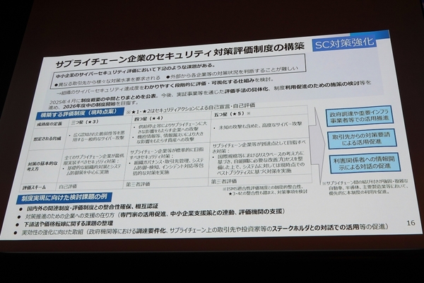加えて、政府が進めるサプライチェーン攻撃に対する施策が、経済産業省が主導する「サプライチェーンのセキュリティ対策評価制度」だ。現在、多くの日本企業は、取引先ごとに形式の異なる「セキュリティチェックリスト」への回答に忙殺されている。セキュリティ対策を評価する発注側(上位企業)も回答内容を精査できず、実効性が伴わない形式的な運用に陥っているケースが散見されるという。この課題を解決するために、国が統一的な基準を設け、企業の対策状況を「星」の数で可視化する制度の設計が進められている。