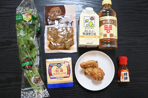 ザーサイを刻んで、酢と醤油を加え、アツアツの豆乳を注ぐ。すると、酢の“酸”によって豆乳がおぼろ豆腐のような状態に固まるんですね。そこに、チキンをのせて、パクチーを添えてできあがりです。