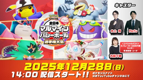 大会配信は12月28日14時から『ポケモンユナイト』公式YouTubeで実施予定。水上侑さん、Refuさんという公式生配信ではおなじみのキャスターに加えて、元日本代表選手で現在は解説者やコーチとして活躍されている古藤千鶴さんがスペシャルゲストとして参加します。