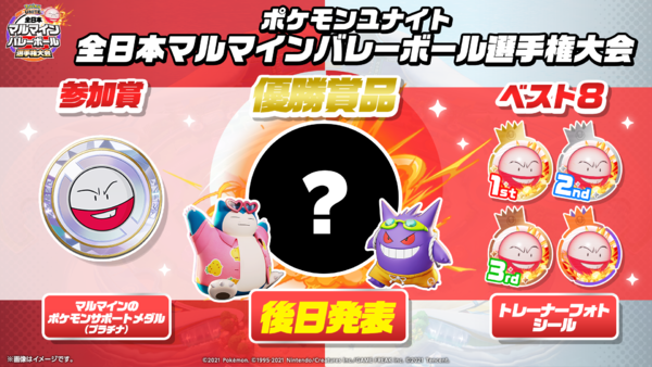 全日本マルマインバレーボール選手権大会では各種賞品を用意。参加賞は「マルマインのポケモンサポートメダル(プラチナ)」。ベスト8賞は「特別なトレーナーフォトシール」。優勝賞品は後日発表となっています。