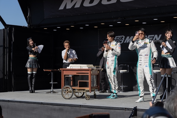 サプライズとして大草選手の誕生日イベント、そして今シーズンでSUPER GTを引退する伊沢選手の卒業式も開催。家族からのメッセージに思わず涙ぐむ伊沢選手の姿が印象的でした。