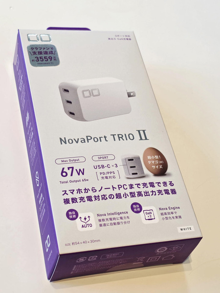 今回衝動買いしたNovaPort TRIO IIは、従来モデルのNovaPort TRIOからType-Aを廃止し、Type-C×3へと刷新されたモデルだ。最大出力は67W(合計65W)で、USB PD/PPSに対応。スマートフォンからノートPCまで幅広くカバーする。本体サイズは従来モデルよりも高さ・長さともにわずかに小さくなった一方で、重量は約10g増加している。