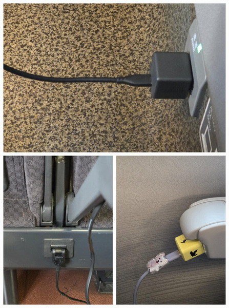 東海道新幹線で約7割を占めるN700A系では、コンセントは窓側足元に1口のみ。新型のN700S系ではアームレストに各席1口が用意されているが、出入り時にケーブルが引っ掛かりやすい微妙な位置でもある。一方で北陸新幹線のE7系では前席下に配置されており、比較的使いやすい。