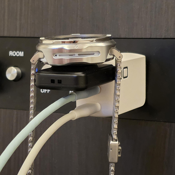 宿泊先のホテルでは、ベッドサイドのコンセントにNovaPort TRIO IIを挿し、Type-Cケーブルを2本接続。さらに最上段ポートには、Galaxy Watch Ultra+金属ブレスを載せたType-C直差しワイヤレスドック(総重量実測158g)を接続してみた。結果は、こちらも問題なし。重心が外側に寄っても、脱落する気配はなかった。