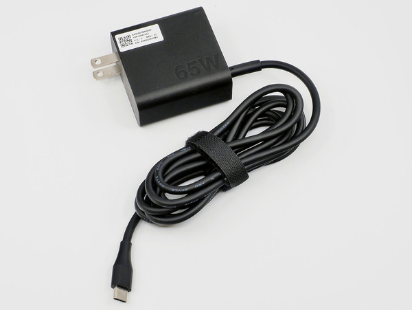 本体充電はUSB4端子に専用ACアダプタ(USB PD)を挿して行なう。ACアダプタの定格出力は65Wなので、平均的なモバイルノートPC並みかひとつ上の出力と言えるだろうか。最近ではUSB充電器もポータブルバッテリーも65W出力対応の製品選択肢が豊富なので、それらと組み合わせてもよいだろう。
