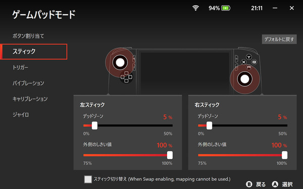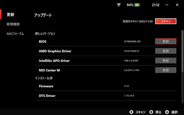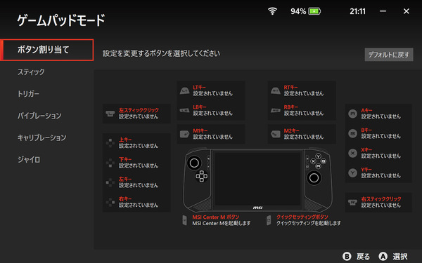 ではここからは電源を投入して実際に動かしてみたい。電源ボタンを入れ起動すると、通常のWindowsデスクトップ画面ではなく専用UI「MSI Center M」が表示される。ここはゲームライブラリとしてインストール済みゲームが表示され、登録済みゲームの起動が行なえる。パッド操作やタッチ操作に適したUIだ。また、MSI Center Mではゲームパッド/キーボードの操作として、両モードにおけるスティックやボタンの挙動を設定できたり、Claw A8 BZ2EMのBIOSやドライバなどのアップデートできたり、ネットワーク接続の管理、そのほか各種設定も行なえる。
