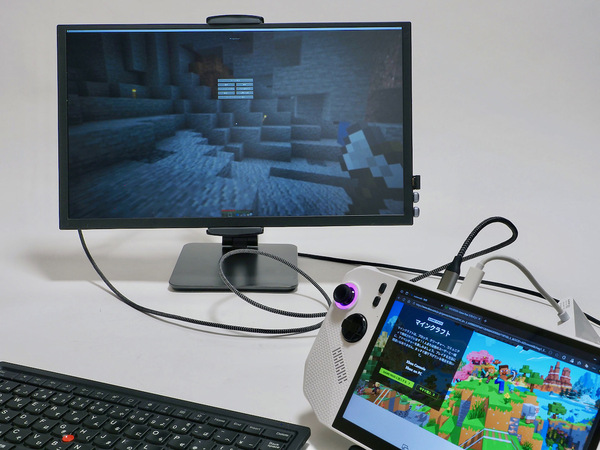 この状態でキーボード入力もできるし画面も見やすくなった。しかし本格的にClaw A8 BZ2EMを使い倒すなら、もっと大きな画面がほしい。外部ディスプレイ(やテレビ)に接続したほうが快適だ。Claw A8 BZ2EMのUSB4端子は映像出力にも対応している。USB Type-C対応のディスプレイならUSB Type-Cケーブル(ただし映像対応であることを要確認)で、ほかはUSB Type-C→HDMI(あるいはDisplay Port)変換ケーブルを使って接続することになる。こうなると本体上にもディスプレイがあるものの、ミニPC的な使い方だ。