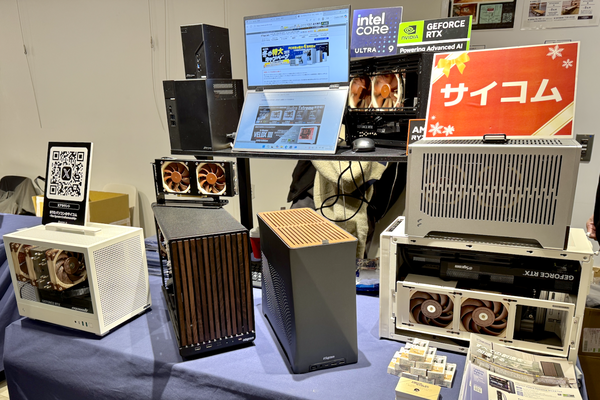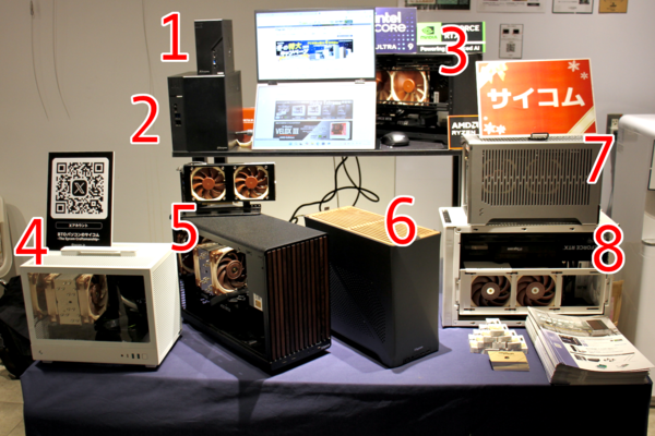 「匠の技を、凝縮」とうたうだけあり、なんとブースに8台もの小型PCを並べたサイコム。これには来場した方々はもちろん、編集部員も「や……やりやがった……!!」と驚いていました。