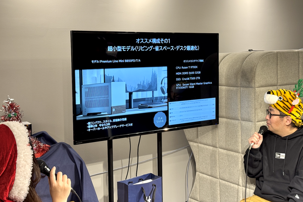 そこから、省スペースを意識した「超小型モデル」、ゲームや動画編集も可能な「ミドルコンパクト」、ハイパフォーマンスな「小型持続的高性能設計」など、具体的なオススメ構成を紹介していました。
