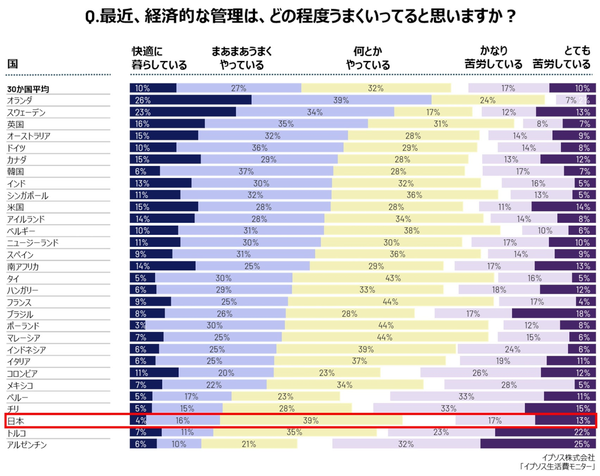 ・経済的なやりくりが「うまくいっている」は2割で、30カ国平均を大きく下回る