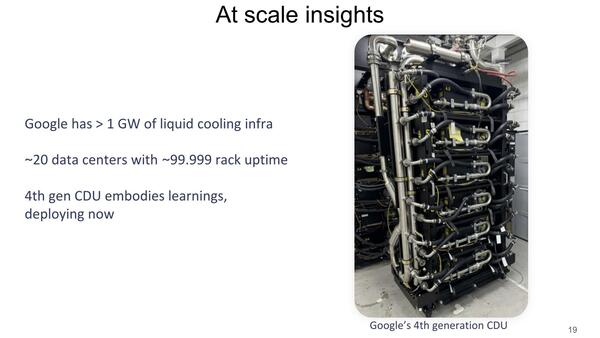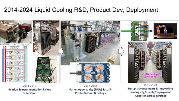 この分野に関して、かなり昔から研究していた先駆者がGoogleである。公式には2018年から液冷を利用していると公表しているが、社内では2014年から実装を開始、2018年には社外にも提供できる品質と性能のものが完成し、2024年には1GWの冷却に対応できるものが完成したとしている。