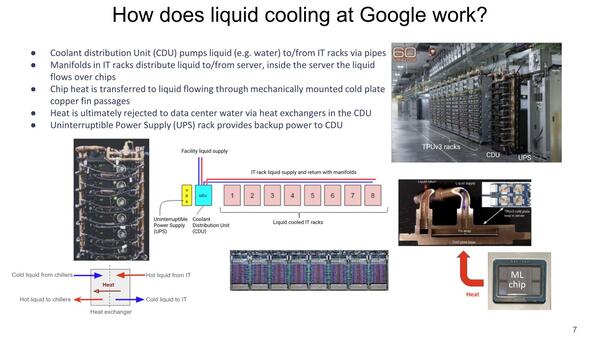 まずチップの冷却で言えば、TPU v3世代は複数のチップをSeries(直列)につないでおり、これは冷却液の流量をそれほど高めなくても済むメリットがある一方、温度管理に問題があったという。