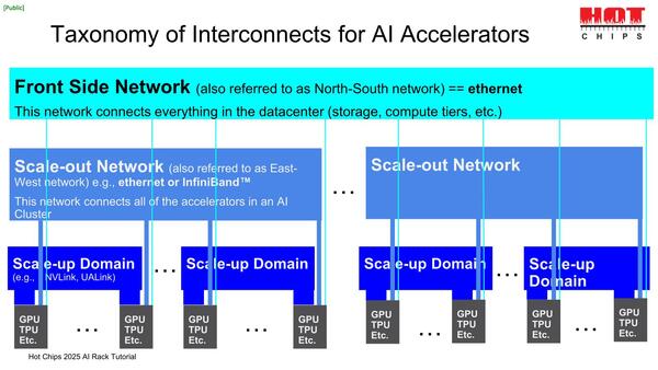 Scale-upは密結合のネットワークで、NVIDIAならNVLinkを、AMDその他は現在UALinkの採用を進めている最中である。これは通常ラック内ないし隣接ラック程度に留められる。より広範囲な相互接続はScale-outになる。Front Sideは管理などのために使われる