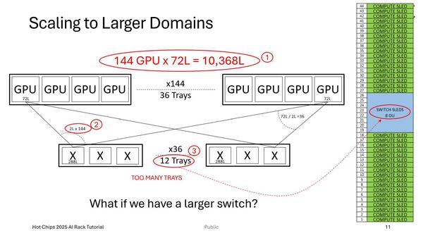 例えば下の画像はNVL72の模式図であるのだが、NVIDIAは次世代でRubinベースのNVL144の提供を予定しており、配線もおそろしい(1万368本のNVLinkによる相互接続になる)うえ、スイッチだけで12本ものシャーシを占有することになり、Scale-upの限界が近いとしている。