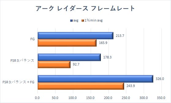 リフレッシュレート240Hz(240fps)の張り付きプレイはさすがに厳しいが、「FSR Frame Generation」を効かせることで、平均フレームレートは240fpsを余裕で超えている。240Hz駆動のゲーミングディスプレーを活かしたプレイを十二分に楽しめるだろう。