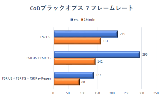 そのうえで、フレーム生成「FSR Frame Generation」(FSR FG)を有効に設定した。さらにGPU負荷は高いがレイトレーシングの「レイトレーシングリフレクション」を「低」に設定し、「レイトレーシングデノイザー」で「FSR Ray Regeneration」(FSR Ray Regen)を選択した状態も確認してみた。