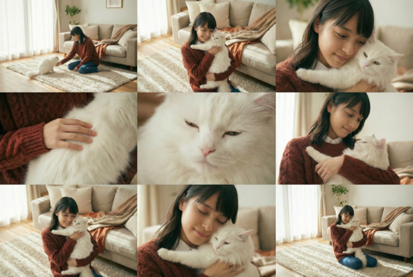 また、生成した分割画像は指定してアップスケールさせることで、そのカットだけ取り出すことができます。明日来子さんと猫の9分割のシーンを読み込み「KF1の画像だけ取り出して」と指示したものです。その結果、KF1だけがアップスケール化されて出てきます。