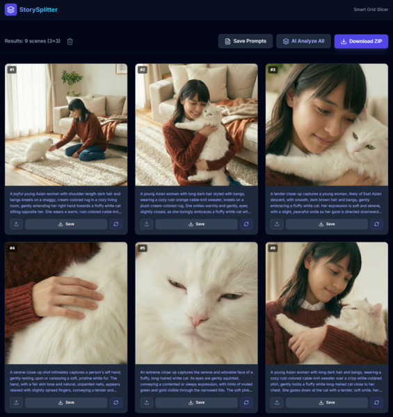 筆者は、最初はPhotoshopで分割してセーブしていましたが、Google AI StudioのBuildを使って、自動で分割するアプリ「StorySplitter」を作成してみました。画像を分割して一括セーブするだけでなく、Gemini Flashをつかってその画像のプロンプトを生成する機能も入れてあります。分割も3x3だけでなく、2x2、4x4など多様な分割に対応しています。無料で公開していますので、自由にお使いください(リンクは記事の末尾)。