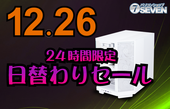 セブンアールジャパンが運営するパソコンショップSEVENは、12月26日の0:00から23:59までの期間、24時間限定セールを開催する。このセールでは、最新のゲーミングPCやデスクトップPCが最大95,000円オフとなる。