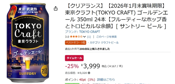 「東京クラフト ゴールデンエール」が、現在開催中のAmazonタイムセールにより、24本セットが25%オフで購入できる機会となっています。