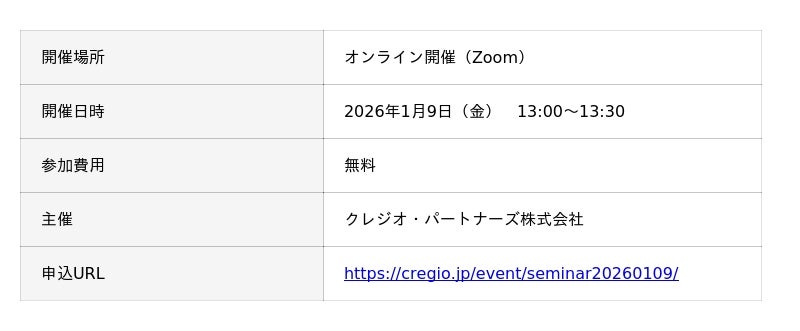- 参加申込方法:https://cregio.jp/event/seminar20260109/