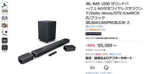 JBLのサウンドバー「BAR 1000」が、Amazonセールに登場しました。参考価格143,000円から44%オフの80,645円という、衝撃的なお買い得価格となっています。