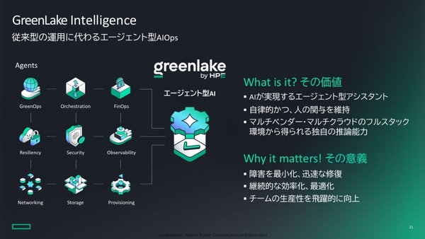 また、エージェント型AIOpsのフレームワークとして提供されるのが「GreenLake Intelligence」である。NetworkingやStorege、Serverなどの各領域に実装されたエージェントが相互に連携して、インサイトを提供したり、問題を解決してくれる。まずは、Aruba Networking Centralでの実装が予定されている。