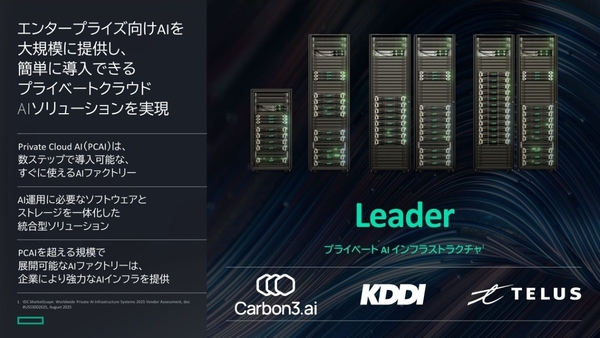 HPEでは、2025年1月よりNVDIAと共同開発した「HPE Private Cloud AI」を国内展開している。AI基盤に必要なコンポーネントをパッケージ化した“ターンキー型ソリューション”であり、大規模環境やカスタマイズが必要な顧客向けには「AI Factory at Scale」というラインアップも用意していくという。