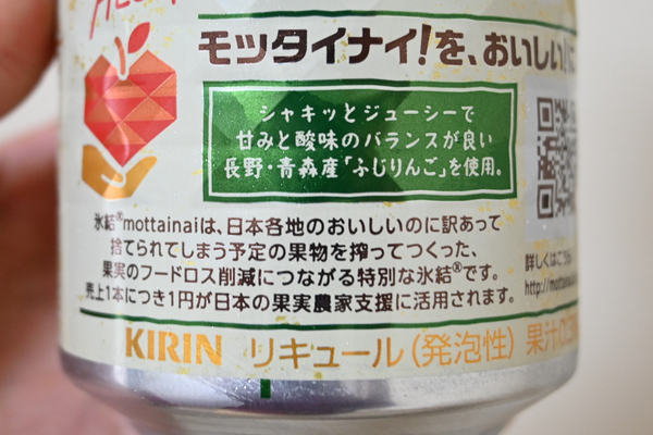さらにちょっとおもしろい取り組みとして、今回の「キリン 氷結 mottainai ふじりんご」は、売り上げ1本につき1円が、日本の果実農家支援に活用されるそうです。
