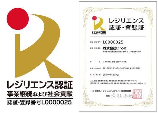 株式会社DroR(本社:東京都渋谷区、代表取締役:山中 真琴)は、政府が推進する国土強靭化の取組にもとづき、事業継続と社会貢献に積極的に取り組む企業を認定する「レジリエンス認証(事業継続および社会貢献)」を取得しました。