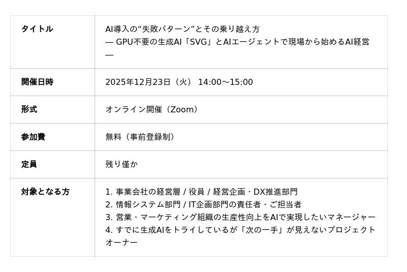 - 2025.12.03 (水) 自社ウェビナーシリーズ第1弾開催のお知らせ ― NexTech Week 2025秋で大反響の「GPU不要生成AI×AIエージェント」をオンラインで深掘り解説 ―