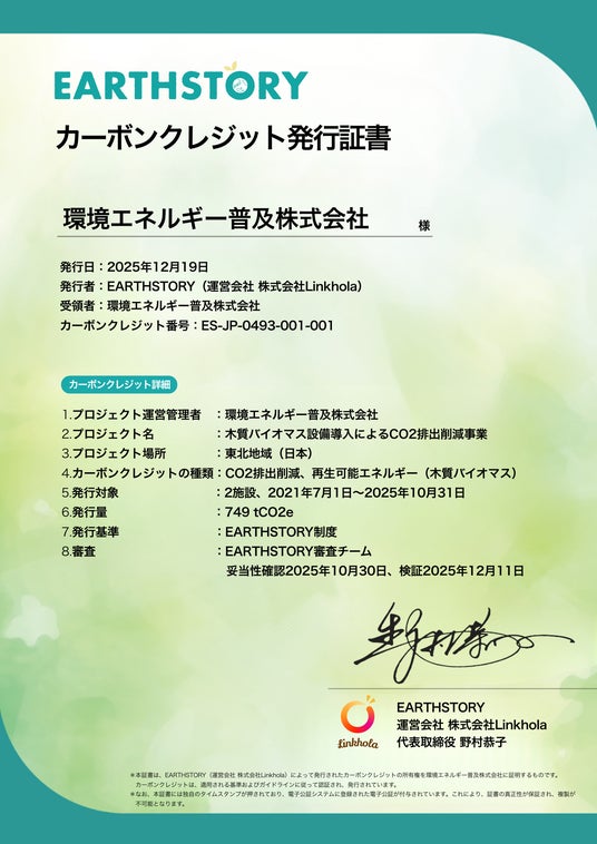 株式会社Linkhola 代表取締役 野村 恭子(環境学博士、技術士(環境))「今回、木質バイオマス領域で、地域の未利用資源活用を象徴するバイオマスプロジェクトを支援できたことを光栄に思います。9月に早稲田大学の鷲津教授と岩手銀行と現地視察を快く受け入れていただき、導入先の2か所の施設を見学させていただきました。株式会社環境エネルギー普及の皆様が地元の林業家やチップ工場と共に試行錯誤して、資源の循環利用と雇用創出など持続可能な取り組みの仕組み化と実行力に感銘を受けました。今回、プロジェクト申請から3か月以内で発行できました。クレジットの販売収益がプロジェクト関係者に還元され、継続的に回ることを願ってます。EARTHSTORYボランタリークレジット制度は、『顔が見える』ストーリー性のある地域貢献型プロジェクトを、『超速』でどこよりも早くお届けしていきます。」