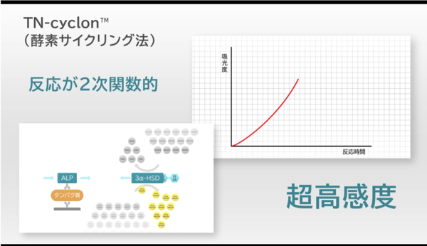 TN-cyclonでは、まずサンドイッチELISAによって目的タンパク質を確実に捕まえ、その後、酵素サイクリングによって同じ分子からの信号を何度も増幅する。これにより、従来は見逃されがちだった極微量のタンパク質でも検出可能となるという。