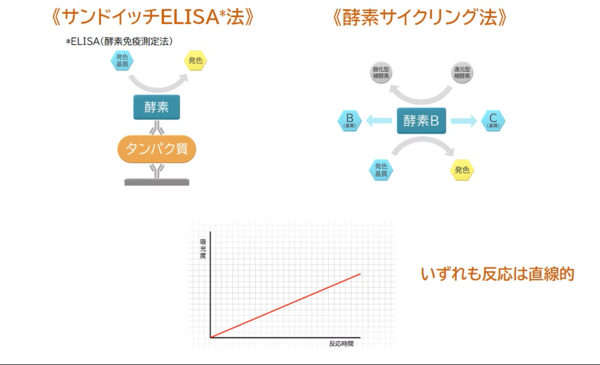 サンドイッチELISAは、目的のタンパク質を抗体で両側から挟み込んで捕捉する方法で、狙ったタンパク質を高い確実性で測定できる。一方、酵素サイクリングは、反応によって生じた信号を繰り返し増幅することで、微弱な変化でも検出しやすくする技術である。