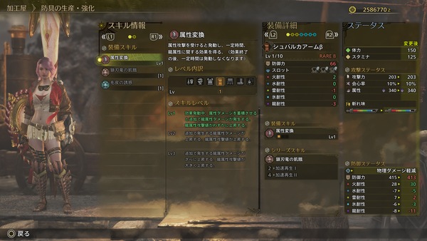 そんな「属性変換」は、看板モンスターでもあるアルシュベルドの防具で発動可能。もちろん、護石などで発動させてもいい。スキルレベルは1でも効果が見込めるとのことなので、ぜひゴグマジオス戦用の防具を見直してみてはいかがだろうか。