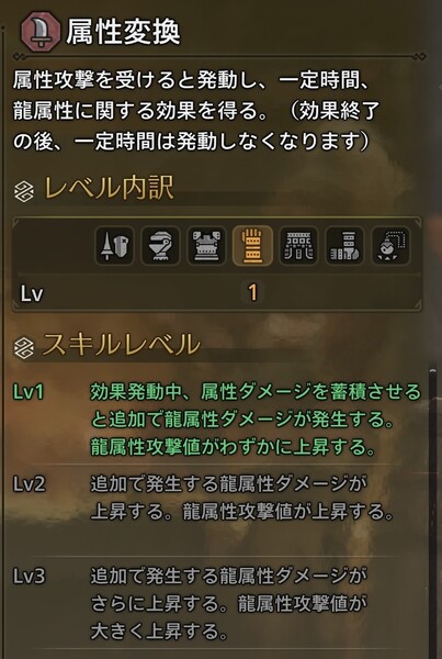 そのスキルこそが「属性変換」。効果をかいつまんで説明すると、「敵から属性攻撃を受けるとこちらの龍属性がブーストされる」というもの。今回のギミックにぴったりのスキルで注目を集めている。