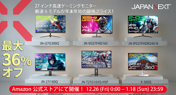 JAPANNEXTは12月26日、27インチゲーミングモニター全6機種を対象に最大36%割引となる「Amazon年末年始特別セール」を開催すると発表した。期間は12月26日から2026年1月18日23:59までの約3週間にわたり、JAPANNEXTの厳選製品が特別価格で手に入るチャンスだ。