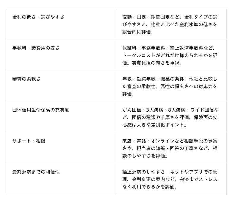 各サービスについては、実際の利用者からの口コミと、当メディアによる独自調査を掛け合わせた住宅ローンの総合ランキングを掲載。評価基準の透明性を重視し、「金利の低さ・選びやすさ」「手数料・諸費用の安さ」「審査の柔軟さ」など、指標ごとの強み・弱みを可視化しました。これにより、従来のランキングでは見えづらかった利用する上でのリアルな評価を、ユーザー目線で提供しています。