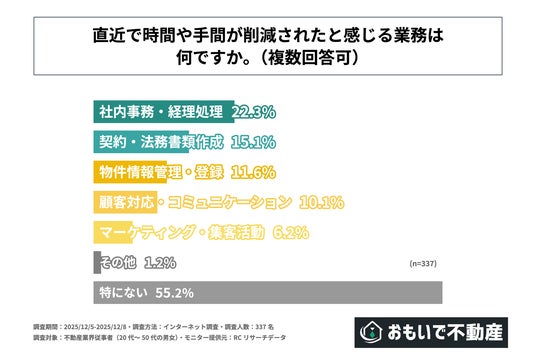 また、「直近で時間や手間が削減されたと感じる業務は何か」を尋ねる設問への回答では、1位が「特にない」で55.2%、2位が「社内事務・経理処理」で22.3%、3位が「契約・法務書類作成」で15.1%という結果になりました。この結果から、不動産業界従事者の半数以上が、時間や手間が削減されたと感じる業務は「特にない」と考えている一方、具体的に削減されたと感じる業務として挙げられたのは、主に「社内事務・経理処理」や「契約・法務書類作成」であることがわかりました。