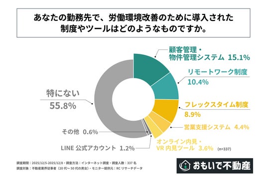 続いて、「勤務先で労働環境改善のために導入された制度やツールはどのようなものか」を尋ねる設問への回答では、1位が「特にない」で55.8%、2位が「顧客管理・物件管理システム」で15.1%、3位が「リモートワーク制度」で10.4%という結果になりました。この結果から、労働環境改善のために導入された制度やツールは「特にない」人が最多である一方、導入された制度やツールとして多かったものは、「顧客管理・物件管理システム」や「リモートワーク制度」であることが判明しました。