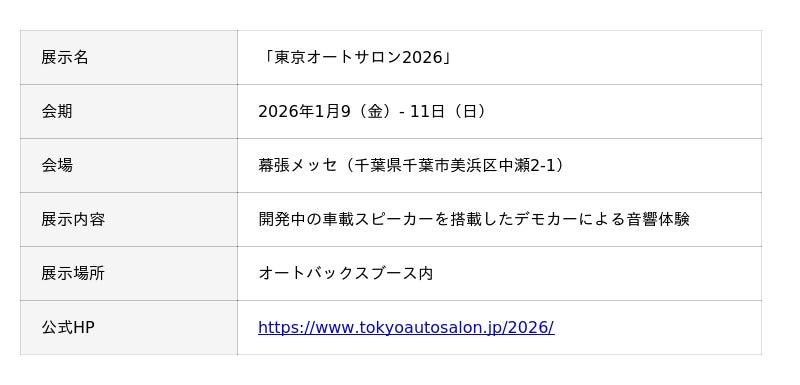 今回、2026年1月9日(金)から11日(日)まで幕張メッセで開催される「東京オートサロン 2026」のオートバックスブース内にて、当社製の車載スピーカーを搭載したデモカーを出展します。