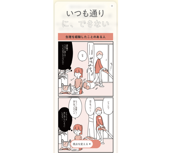 前述のリアル展示は、生理・PMSに伴う症状やつらさに個人差があることを可視化したもの。当時の来場者からは「自分の症状と向き合うきっかけになった」「人によってつらさが違うことを知った」といった声が寄せられたといい、こうした反響を受け、場所や時間を問わず閲覧できるコンテンツを目指した。